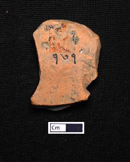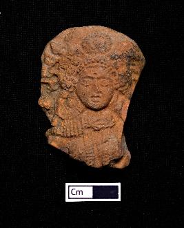 | Description / विवरण | A terracotta plaque showing a female figurine with decorated headgear with beaded design and here are few hair pins placed on the right side of the head gear. Face is completely visible. |