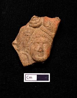 | Description / विवरण | A terracotta plaque showing a female figurine with decorated headgear with beaded design. Face is completely visible. |