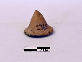 | Description / विवरण | A conical shaped terracotta, handmade games man with a flat circular base and pointy top, the surface is abraded |