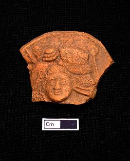 | Description / विवरण | A terracotta plaque showing a female figurine adorned with decorated beaded headgear. Eyes, nose and lips are completely visible. |