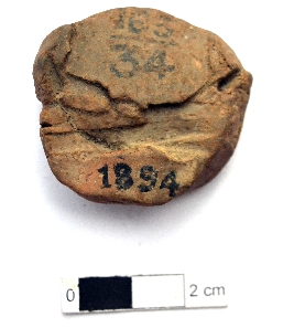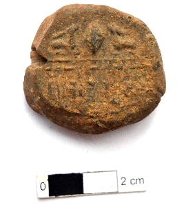 | Description / विवरण | It is an almost circular terracotta sealing of baked clay, the upper half, which is separated from the lower by double horizontal line, depicting two deer and a wheel in-between. The legend is also weathered and not readable. |