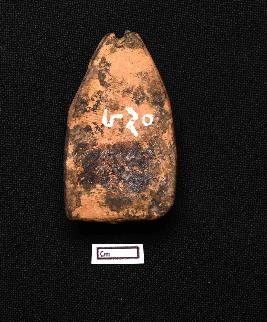 | Description / विवरण | A terracotta plaque showing a male figurine in standing posture. Left hand is rested on thigh while right hand is partly visible. Right leg is bended. Face is almost eroded only nose is visible. |