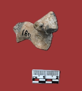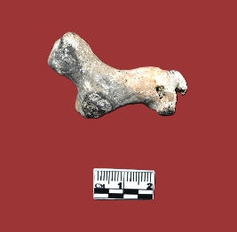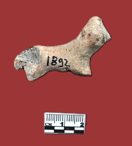 | Description / विवरण | A terracotta figurine of a dog. It has low raised stumpy legs, while the front legs are broken and is short in height. The drooping face and snout along with the ears are visible however other features are not clear. It has a short broken tail. |