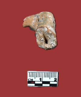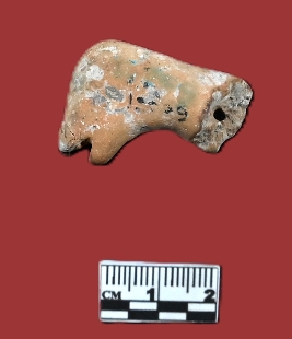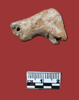 | Description / विवरण | Head of a terracota animal figurine, there is an elongated face on a long cylindrical neck with a slit cut mouth . There is a hole in centre of the neck, visible through the broken section, no others features are prominent on the face |