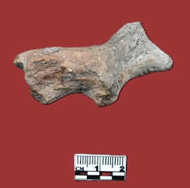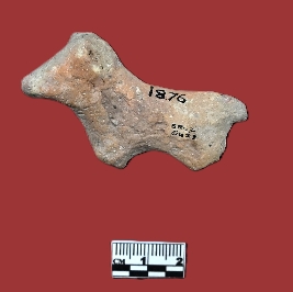 | Description / विवरण | Terracotta figurine of a Dog, having short stumpy legs and a head witha pointed snout . The ears are styled in a manner that the earhole is visible. There is a small tail intact on the back |