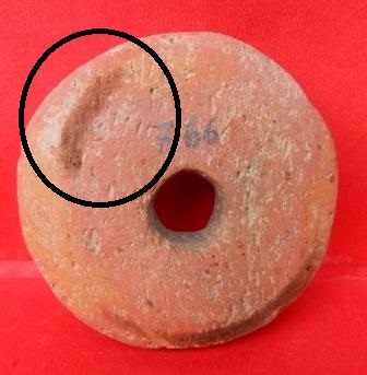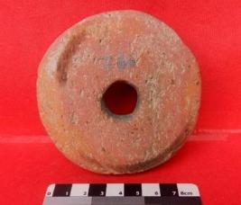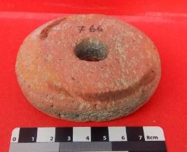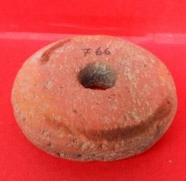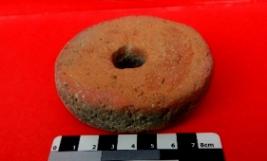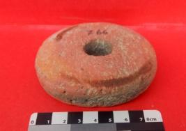 The round disc shaped object identified as Toy wheel by the Excavator, would have been used for entertainment. The object is flat and round in shape, a hole is made between the object.