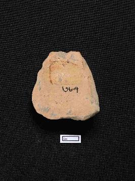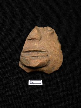 | Description / विवरण | A terracotta plaque displaying a fragmented grotesque head features a distinctly visible left circular eye, a partially exposed sharp nose, and prominently broad lips. The object exhibits a red colour with a smooth surface texture. |