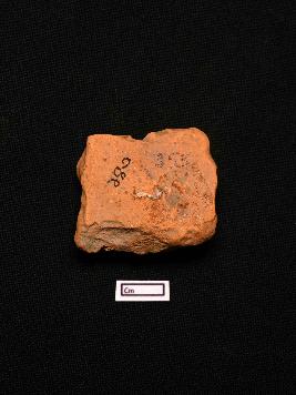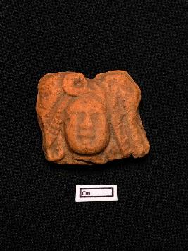 | Description / विवरण | A terracotta plaque, displaying a human head with decorative elements on both sides of the object, reveals a face that is partly visible, with eyes, nose, and lips partially discernible. The surface is smooth, and it features a vibrant red color. |