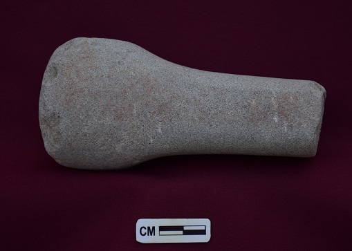 A stone pestle of clubbed shaped is meant for pounding substances in a mortar. Hand modeled.
