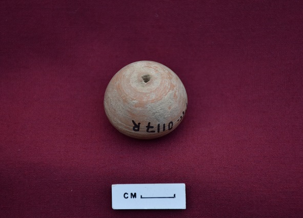 A brown truncated-bicone circular bead meant for threading to make a necklace. well fired, the wheel turned.