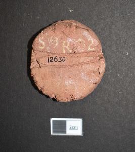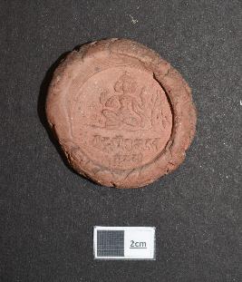 | Description / विवरण | The circular terracotta sealing depicts three-headed and four-armed female deity seated in ardha-paryankashana posture. The deity is holding danda in the upper right arm, rosery in the lower right arm, pasha in the upper left hand, and kamandala in the lower left arm. She is flanked by a tree on her left. The two-line legend is written in lower half portion of the sealing below the deity. The legend is written in Sanskrit language and early medieval Nagari script. |