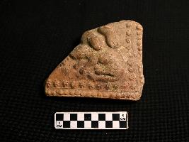 | Description / विवरण | The fragmented terracotta plaque, adorned with a dotted and floral design along its edges, intriguingly depicts a rat alongside the left foot of a human. The object is red in colour with smooth surface. |