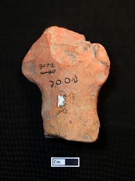 | Description / विवरण | The terracotta plaque features depiction of a human bust. The figurine is portrayed with both hands resting on the waist and legs are adorned with drapery. The object is red in colour. |