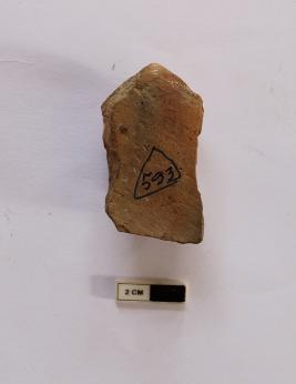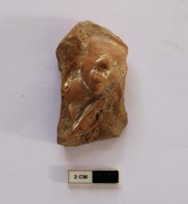 | Description / विवरण | The extant portion depicts the face of a human figure. Only nose and lips are prominently discernible the rest are rolled. It is fashioned from a single mould. |