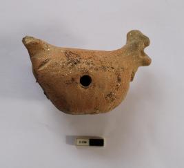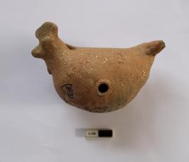 | Description / विवरण | A terracotta bird figurine (toy). there are two sets of perforations through the body - one at the level of the torso and another at the neck part. It is red in color and partially damaged. |