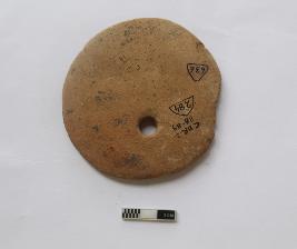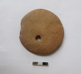 | Description / विवरण | A terracotta net sinker. It is red in color and partially damaged. |