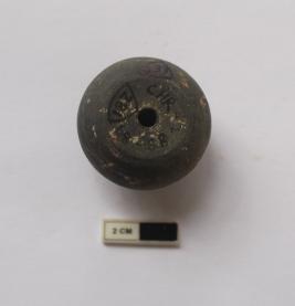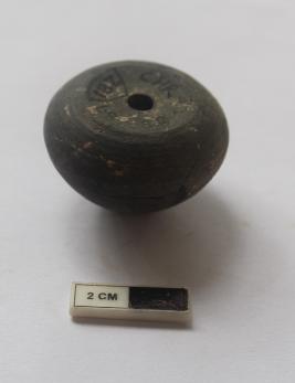 | Description / विवरण | A terracotta arecanut shape bead. It is gray in color. |