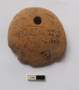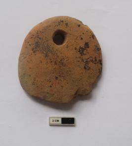 | Description / विवरण | A terracotta net sinker. It is partially damaged and red in color. |