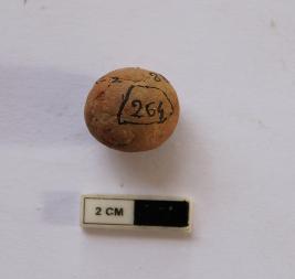 | Description / विवरण | A terracotta bead in a spherical shape. It is dull red in color and partially damaged. |