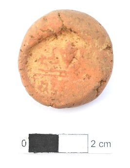| Description / विवरण | It is a terracotta sealing of baked clay. The upper half, which is separated from the lower by double horizontal line, depicting two deer and a wheel in-between. |