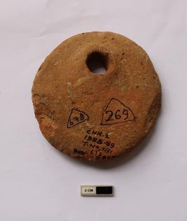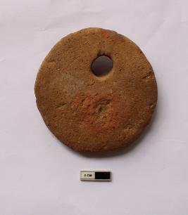 | Description / विवरण | A terracotta net sinker in spherical shape. It is red in color and partially damaged in condition. |