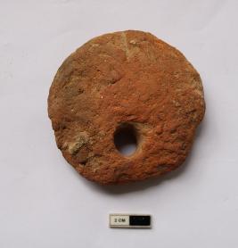 | Description / विवरण | A terracotta net sinker. It is red in color and partially damaged. |