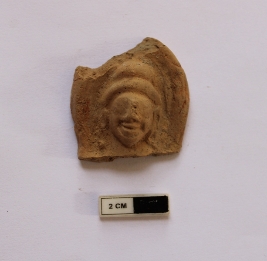 | Description / विवरण | THe extant part depicts the head of a human figurine. It is fashioned from a single mould. Only the nose and the mouth is clearly seen. On the head appears a turban like head gear. |