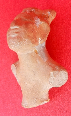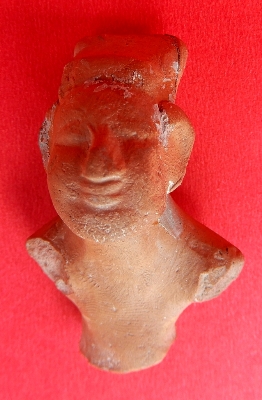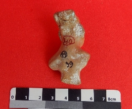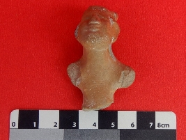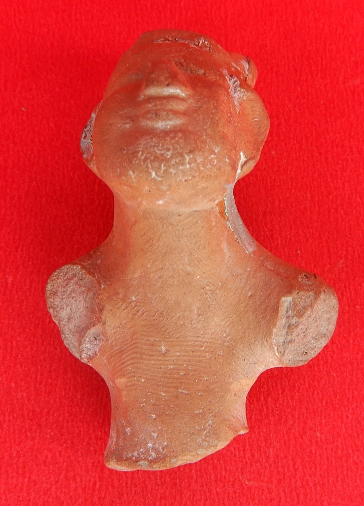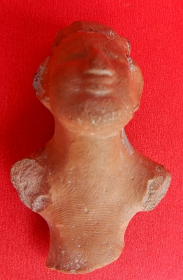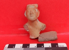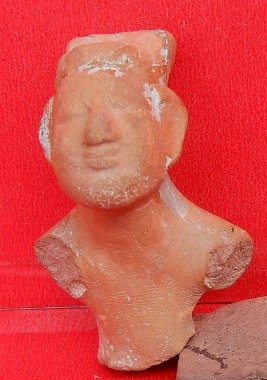 It is a bust of a human being made of terracotta, with both hands chopped off. The object is also broken below the waist. The object has a blunted nose with thick lips. Wavy lines are depicted on the frontal portion of the object.