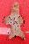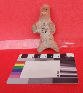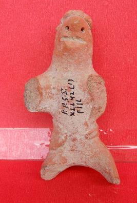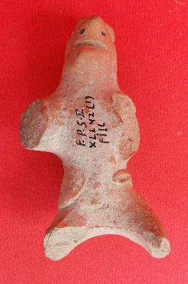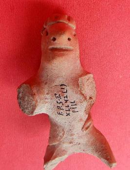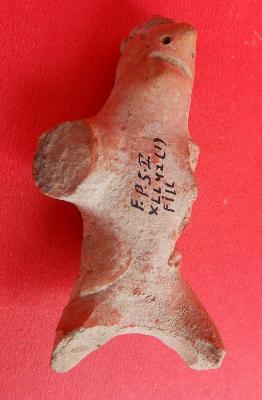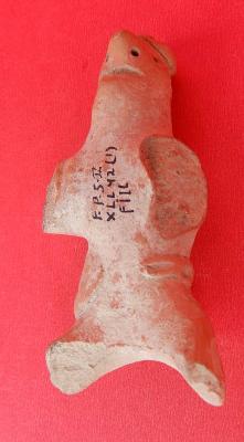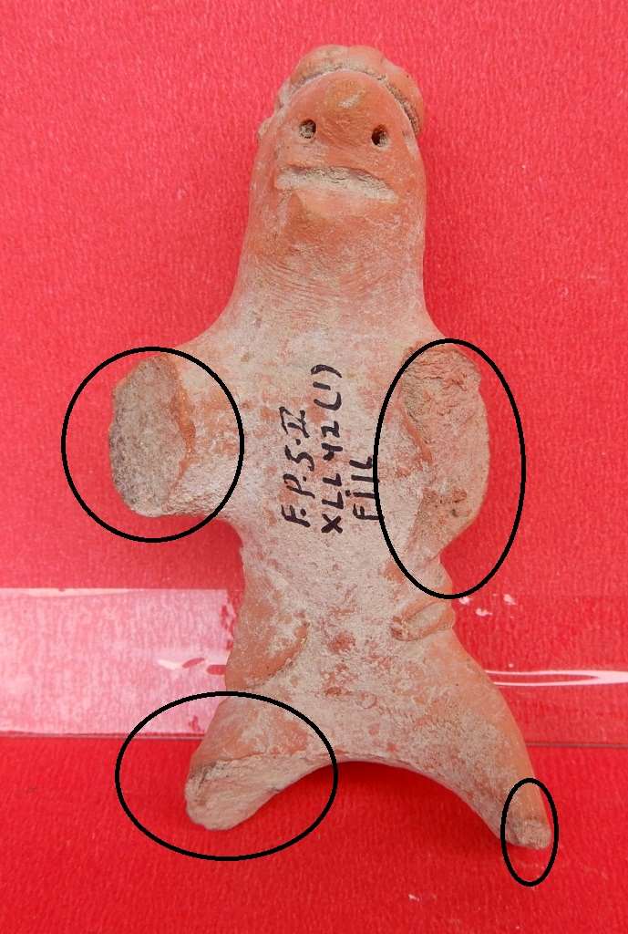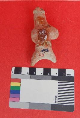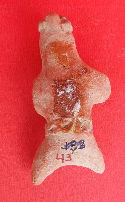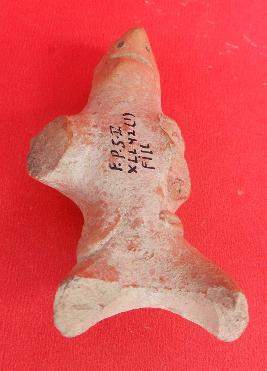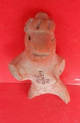 Bust of a human being made of terracotta, with both hands and legs are chopped off. Object has pointed nose with holes. Object adorned with a basket type hat over his head.