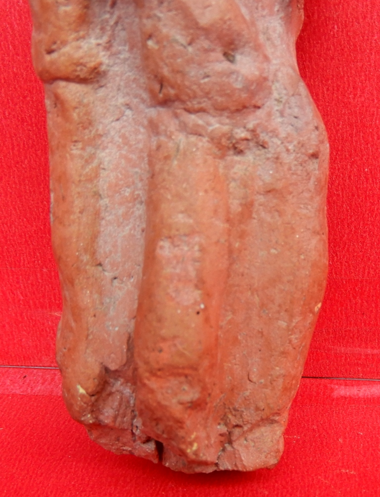 A standing female figure with worn-out features. She is adorned with a flat necklace and a girdle around the waist. Her left hand is raised to his neck, and her right hand is reaching up to the knee.