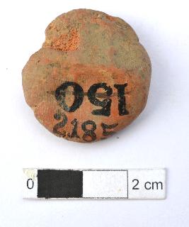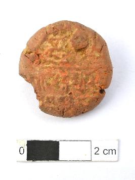| Description / विवरण | It is an almost circular terracotta sealing of baked clay, the upper half, which is separated from the lower by double horizontal line, depicting two deer and a wheel in-between. The legend is weathered and not readable. It is broken on its side. |