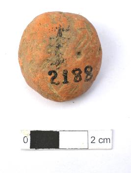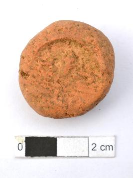 | Description / विवरण | It is an almost circular terracotta sealing of baked clay, the upper half, which is separated from the lower by double horizontal line, depicting two deer and a wheel in-between. The legend written is weathered. |