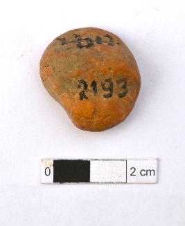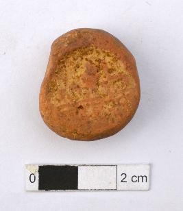 | Description / विवरण | It is an almost circular terracotta sealing of baked clay, upper half, which is separated from the lower by double horizontal line, depicting two deer and a wheel in-between. |