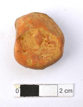 | Description / विवरण | It is an almost circular terracotta sealing of baked clay, t the upper half, which is separated from the lower by double horizontal line, depicting two deer and a wheel in-between. The legend is weathered. It is broken at its sides. |