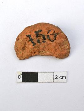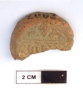 | Description / विवरण | It is a broken terracotta sealing of baked clay, the upper half, which is separated from the lower by double horizontal line, depicting two deer and a wheel in-between. The legend written in later Brahmi script which is weathered . |