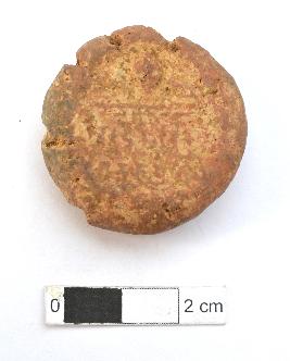 | Description / विवरण | It is an almost circular terracotta sealing of baked clay, the upper half, which is separated from the lower by double horizontal line, depicting two deer and a wheel in-between. |