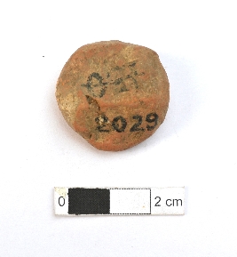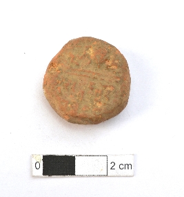 | Description / विवरण | It is an almost circular terracotta sealing of baked clay, the upper half, which is separated from the lower by double horizontal line, depicting two deer and a wheel in-between. The legend written in later Brahmi script which is weathered and not readable. |