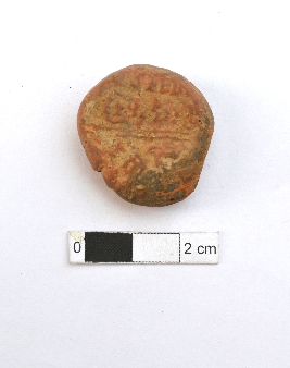| Description / विवरण | It is a Terracotta sealing of baked clay. The upper half, which is separated from the lower by double horizontal line, depicting two deer and a wheel in-between, below it there is legend which is worn out. |