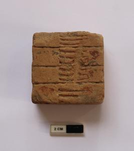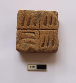 | Description / विवरण | A terracotta weight in a square shape .It is red in color and many incised lines are visible on the surface.It is damaged in condition. |
