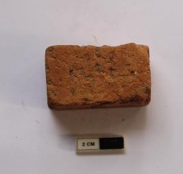 | Description / विवरण | A terracotta weight in rectangular shape. It is red in color and in partially damaged condition and incised line on the surface. |