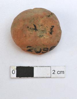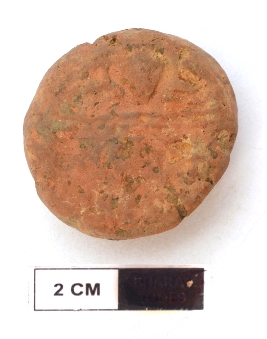 | Description / विवरण | It is an almost circular terracotta sealing of baked clay, the upper half, which is separated from the lower by double horizontal line, depicting two deer and a wheel in-between. |