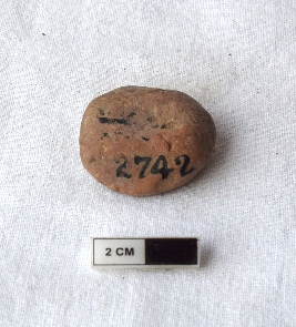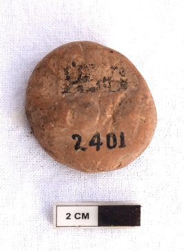 | Description / विवरण | It is an almost circular terracotta sealing of baked clay, the impression is not clear due to weathering. The impression of two deer and a wheel in-between is observed. |