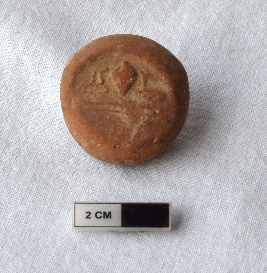 | Description / विवरण | It is a terracotta sealing of baked clay. The upper half, which is separated from the lower by double horizontal line, depicting two deer and a wheel in-between. |
