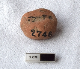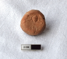 | Description / विवरण | It is an almost circular terracotta sealing of baked clay, the impression is not clear due to weathering but on physical examination one can observe the upper half, which is separated from the lower by double horizontal line, depicting two deer and a wheel in-between. The legend is also weathered and not readable. |