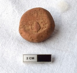 | Description / विवरण | It is an almost circular terracotta sealing of baked clay, the impression is not clear due to weathering but on physical examination one can observe impression of two deer and a wheel in-between. |