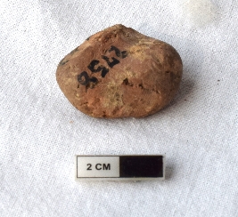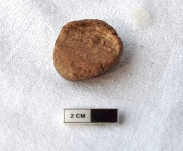 | Description / विवरण | It is an almost circular terracotta sealing of baked clay, there is a faded impression of two deer and a wheel in-between. |