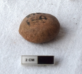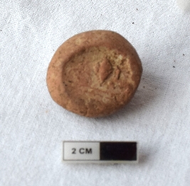 | Description / विवरण | It is an almost circular terracotta sealing of baked clay, the upper half, which is separated from the lower by double horizontal line, depicting two deer and a wheel in-between. The legend is also weathered and not readable. |