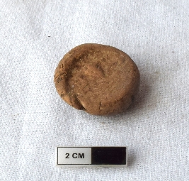 | Description / विवरण | It is an almost circular terracotta sealing of baked clay, there is a faded impression of wheel. |