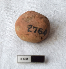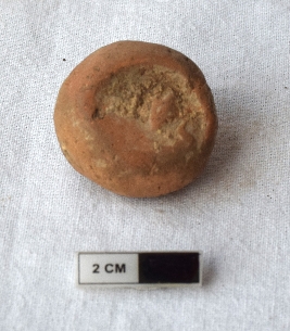 | Description / विवरण | It is an almost circular terracotta sealing of baked clay, there is a faded impression of two deer and a wheel in-between. |