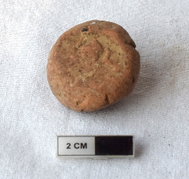 | Description / विवरण | It is an almost circular terracotta sealing of baked clay, there is faded impression of two deer and a wheel in-between. |